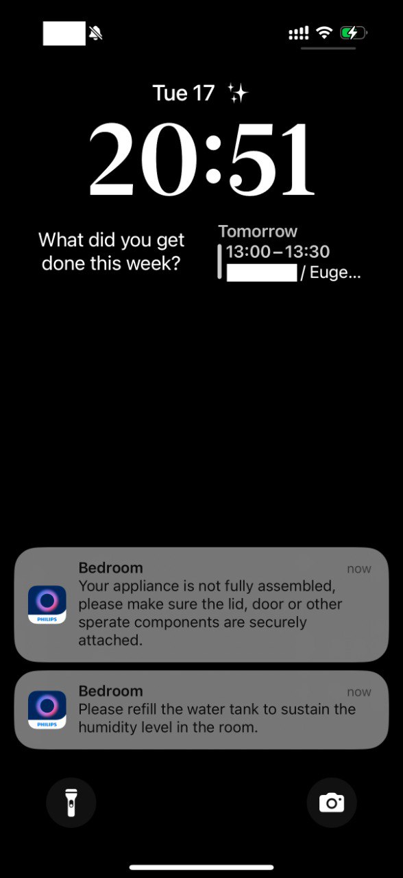 У меня есть очиститель/увлажнитель воздуха, которым можно управлять с телефона. В отличие от товаров, где удаленный доступ добавляют по причине “а прикольно!” (зачем чайнику wi-fi?) — это полезно. Можно например, не вставая с постели, включить тихий режим сна. Другая удобная штука — пуш-нотификации о том, что пора долить воды.И вот приходит мне пуш-нотификация об этом. Я сразу иду и вытаскиваю из очистителя бак, чтобы туда налить воды. Сразу же мне прилетает другое уведомление — “я разобран и не готов к использованию”.
